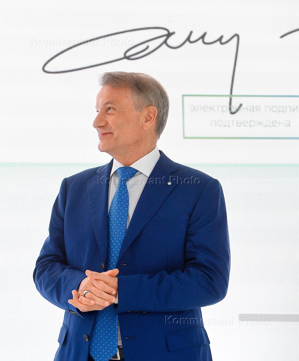 XXV Петербургский международный экономический форум (ПМЭФ) 2022 в конгрессно-выставочном центре (КВЦ) "Экспофорум". Президент, председатель правления Сбербанка России Герман Греф во время подписания соглашения о сотрудничестве с ОАО "Российские железные дороги".