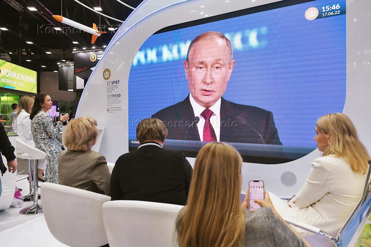 XXV Петербургский международный экономический форум (ПМЭФ) 2022 в конгрессно-выставочном центре (КВЦ) "Экспофорум". Президент России Владимир Путин (на экране) во время трансляции выступления на пленарном заседании.