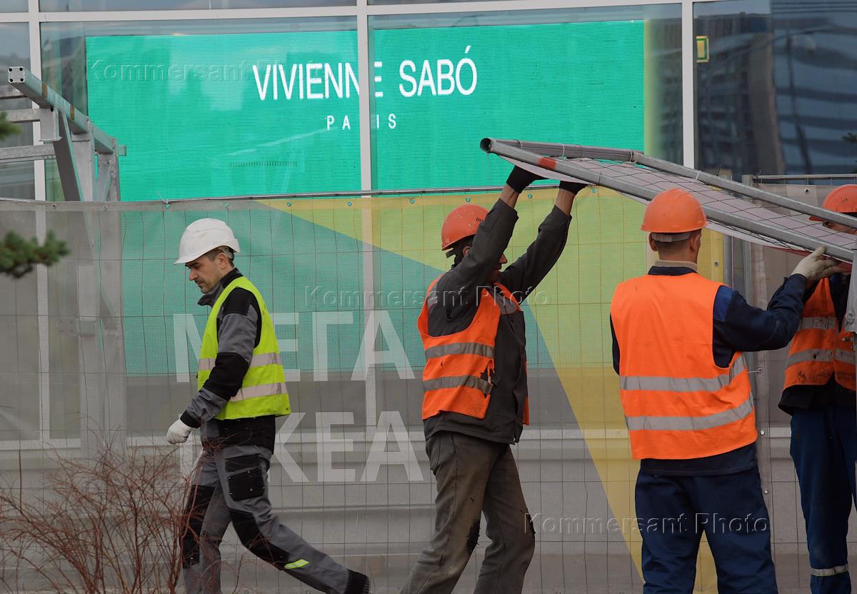 Жанровая фотография. Рабочие во время установки сеточных ограждений на территории торгового центра (ТЦ) "МЕГА Химки".