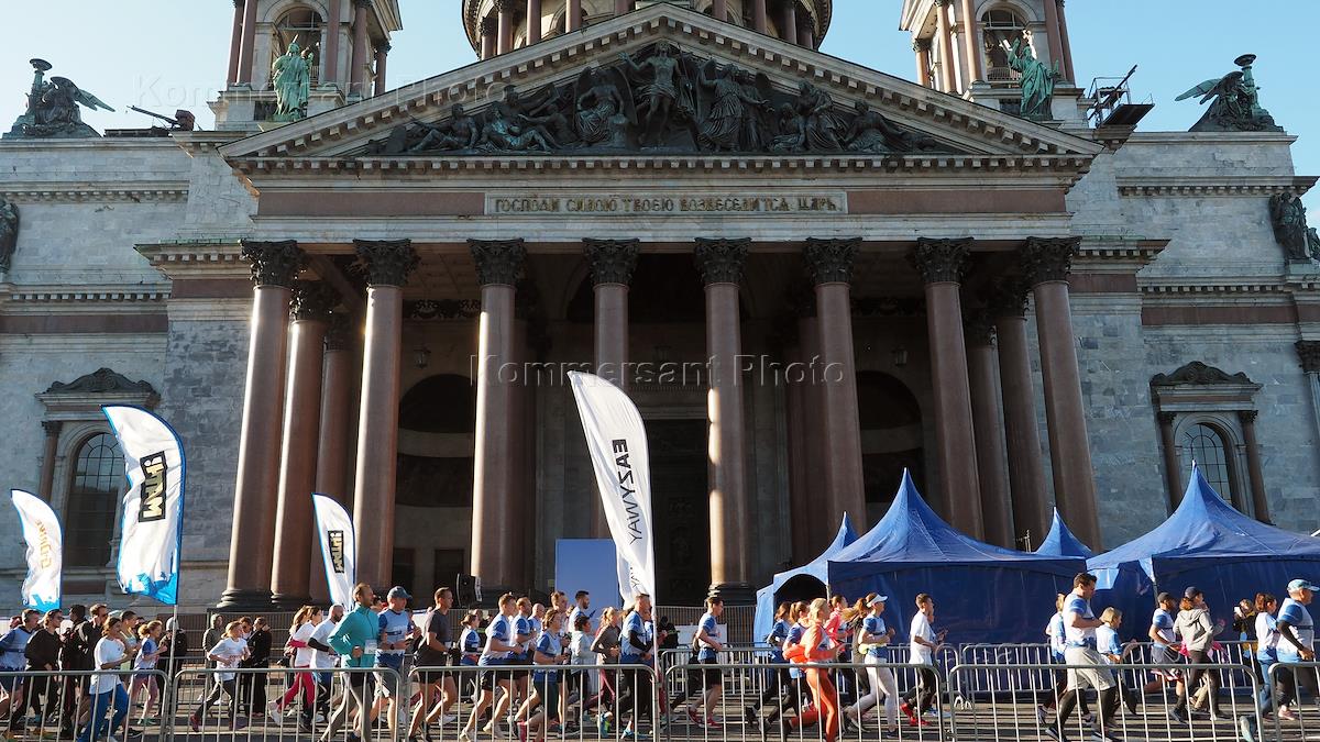 Morning run in the center of St. Petersburg as part of the XXV St. Petersburg International Economic Forum (SPIEF). Participants before the start of the race.