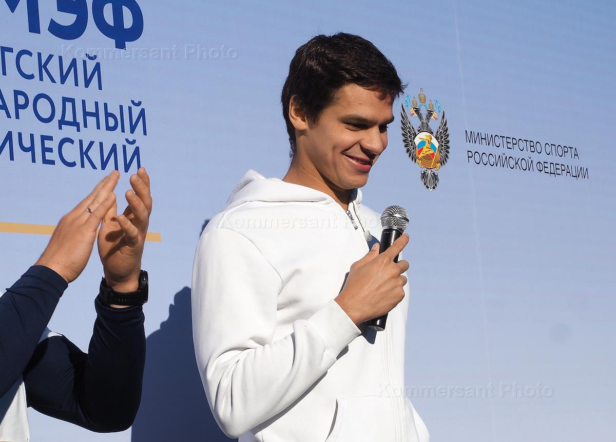 XXV St. Petersburg International Economic Forum (SPIEF) 2022 at the Expoforum Convention and Exhibition Center (CEC). Morning run in the city center "SPIEF run" as part of the forum. Olympic swimming champion Yevgeny Rylov during a speech to the participants of the race.