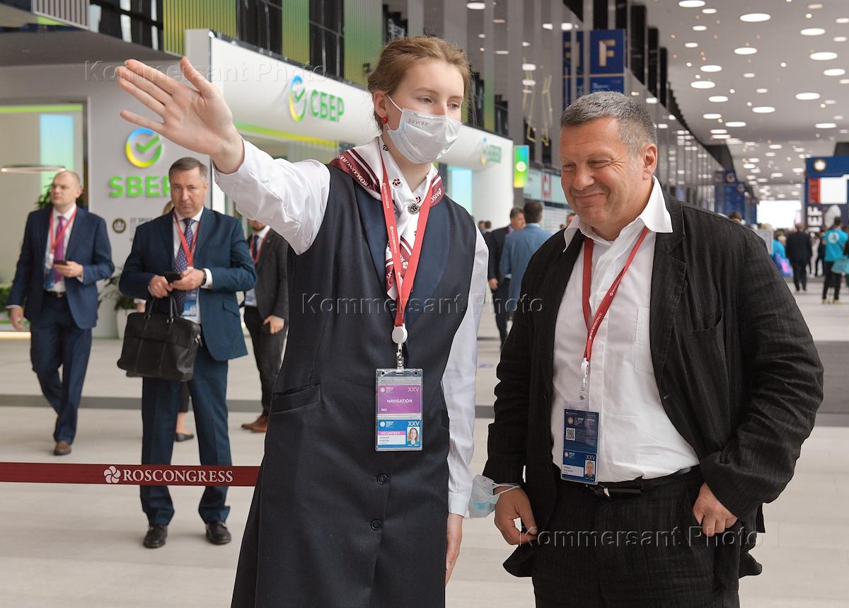 XXV Петербургский международный экономический форум (ПМЭФ) 2022 в конгрессно-выставочном центре (КВЦ) "Экспофорум". Телеведущий Владимир Соловьев (справа) во время форума.