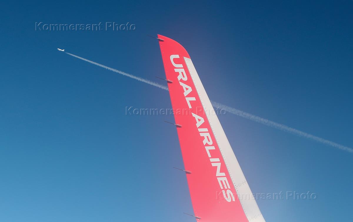 The work of the Moscow Domodedovo Airport named after M.V. Lomonosov. Genre photography. The wing of the aircraft of the airline "Ural Airlines" against the background of a flying aircraft.