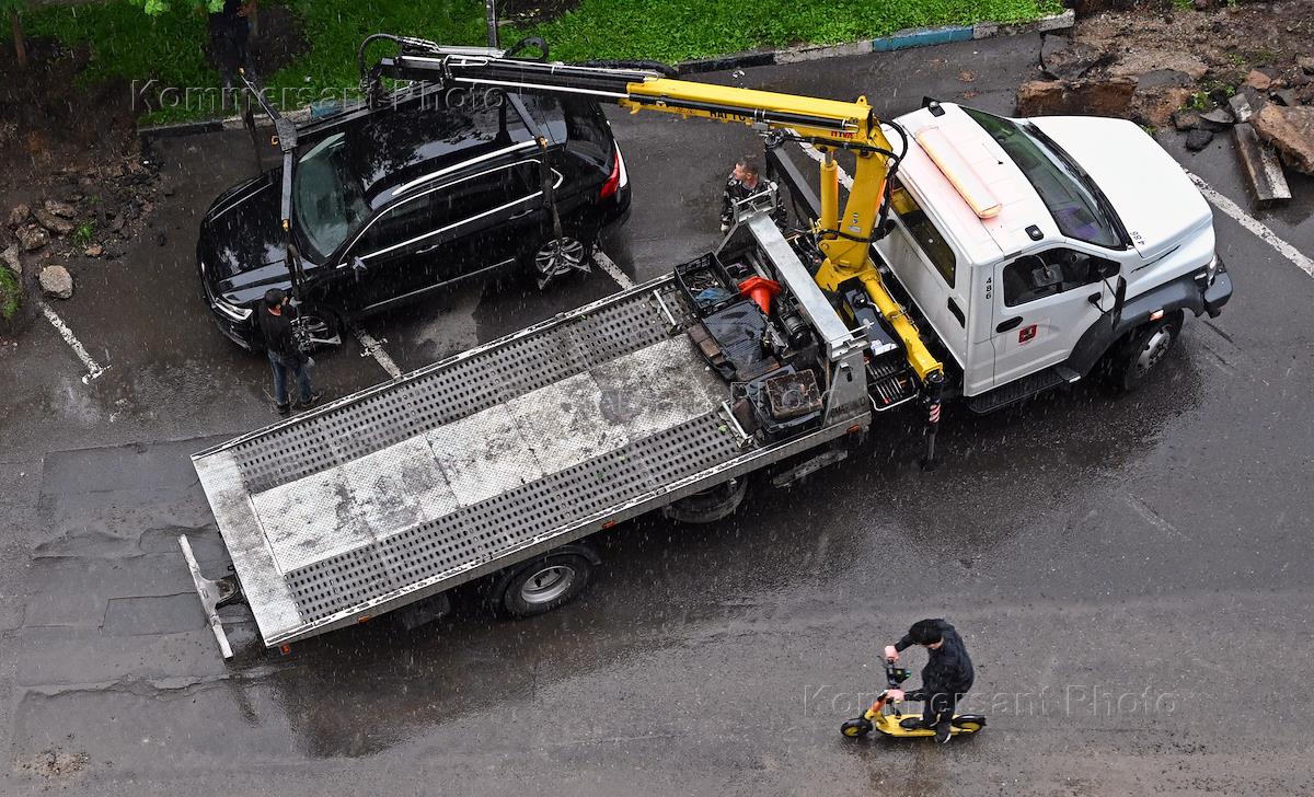 Ремонт дорожного полотна и замена бордюрного камня во дворе на улице Новаторов. Жанровая фотография. Эвакуатор во время эвакуации автомобиля.