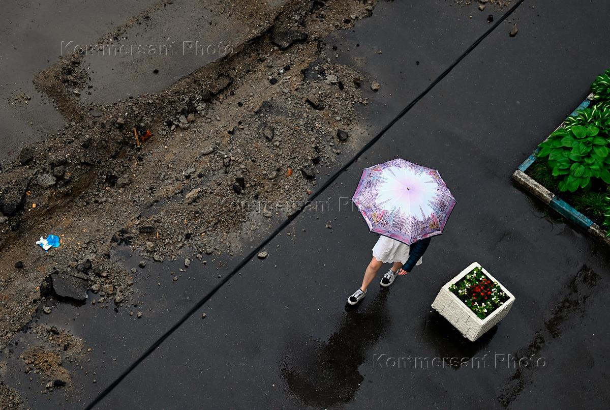 Ремонт дорожного полотна и замена бордюрного камня во дворе на улице Новаторов. Жанровая фотография. Девушка под зонтом идет по ремонтируемому участку дороги.