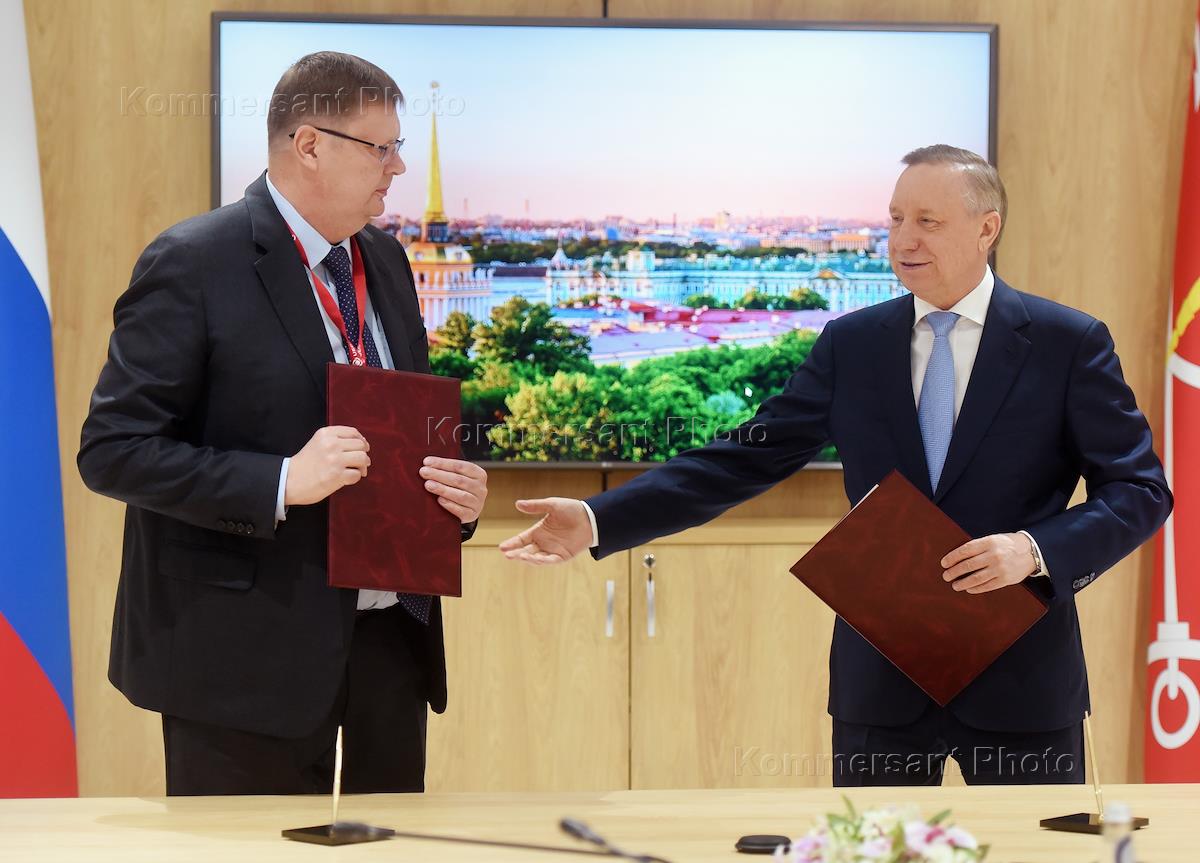 XXV Петербургский международный экономический форум (ПМЭФ) 2022 в конгрессно-выставочном центре (КВЦ) "Экспофорум". День третий. Губернатор Санкт-Петербурга Александ Беглов (в центре) и генеральный директор АО "Объединенная двигателестроительная корпорация" (ОДК) Александр Артюхов (слева) во время подписания соглашения о сотрудничестве.