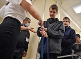 Проведение Единого государственного экзамена (ЕГЭ) по информатике в Государственном бюджетном образовательном учреждении города Москвы "Школе № 429". Жанровая фотография. Сотрудник службы охраны школы во время проверке металлоискателем ученика в фойе перед началом ЕГЭ.