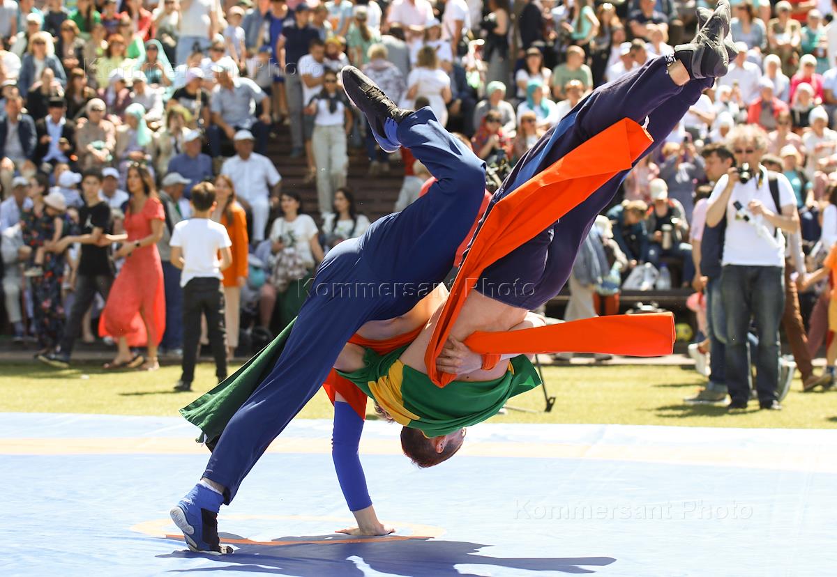 Национальный ежегодный татаро-башкирский праздник "Сабантуй" в жилом массиве "Мирный". Борцы во время соревнований на празднике.