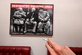 Жанровая фотография. Фотография встречи "Большой тройки" премьер-министра Великобритании Уинстона Черчилля, президента США Франклина Делано Рузвельта и главы Советского правительства Иосифа Сталина на Ялтинской конференции с надписью designated smoking area и рука с сигаретой.