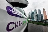 Работа каршеринговой компании "СитиДрайв". Жанровая фотография. Автомобиль компании на фоне небоскребов Московского международного делового центра "Москва Сити".
