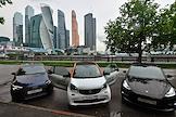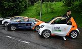 Работа каршеринговой компании "СитиДрайв". Жанровая фотография. Автомобили компании на фоне небоскребов Московского международного делового центра "Москва Сити".