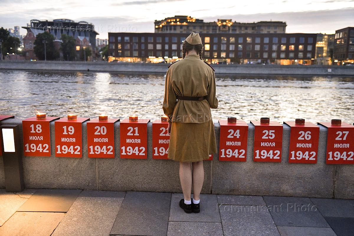 Акция "Линия памяти", посвященная 81-й годовщине начала Великой Отечественной войны, на Крымской набережной парка "Музеон". В память о каждом дне Великой Отечественной войны в рамках акции зажгли 1418 свечей. Участница в военной форме во время акции.
