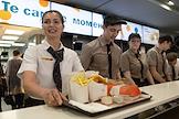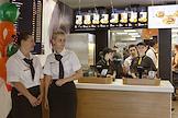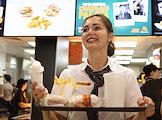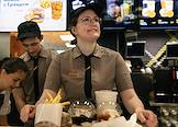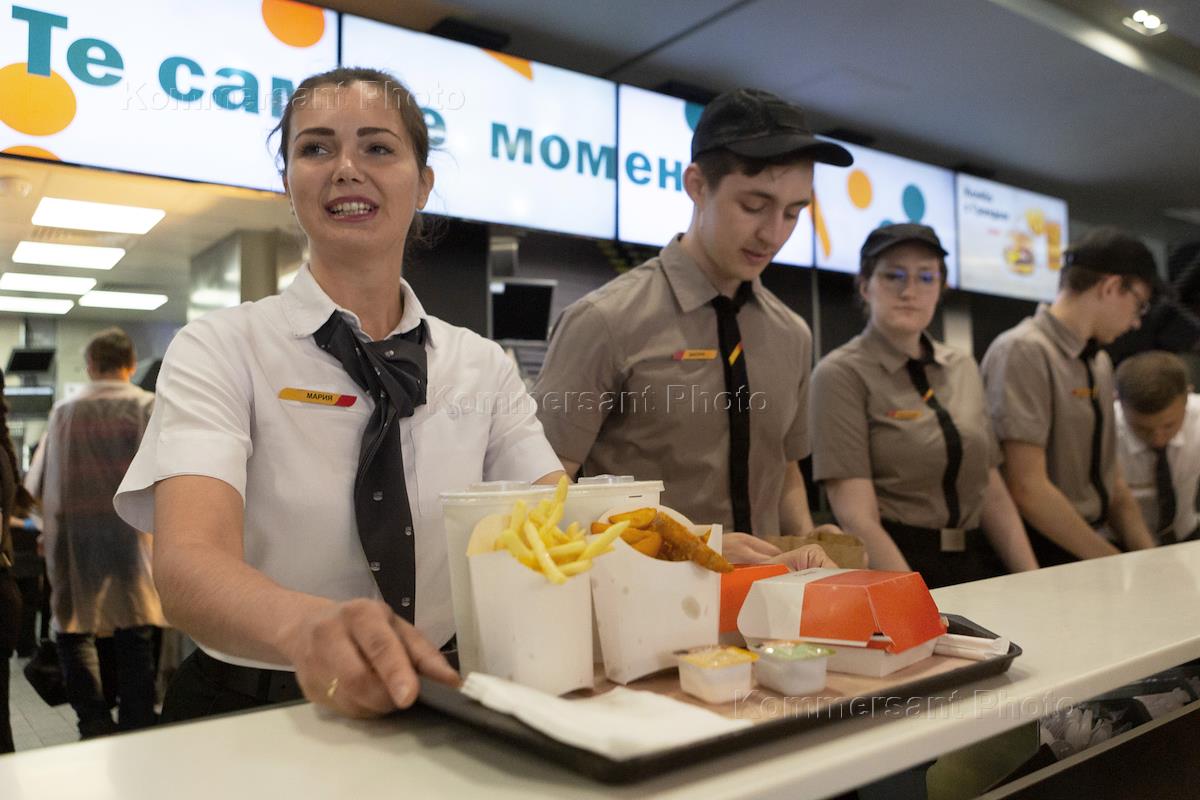 Открытие ресторана сети быстрого питания "Вкусно — и точка" на Каменноостровском проспекте вместо закрывшегося McDonald's. Жанровая фотография. Сотрудница ресторана во время выдачи заказа.