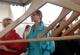 Московская неделя моды на ВДНХ. Коллективный показ дизайнерских коллекций у фонтана "Дружба народов". Жанровая фотография. Модели во время подготовки к показу.