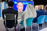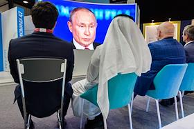 XXV Петербургский международный экономический форум (ПМЭФ) 2022 в конгрессно-выставочном центре (КВЦ) "Экспофорум". Жанровая фотография. Участники форума смотрят выступление президента России Владимира Путина по телевизору.