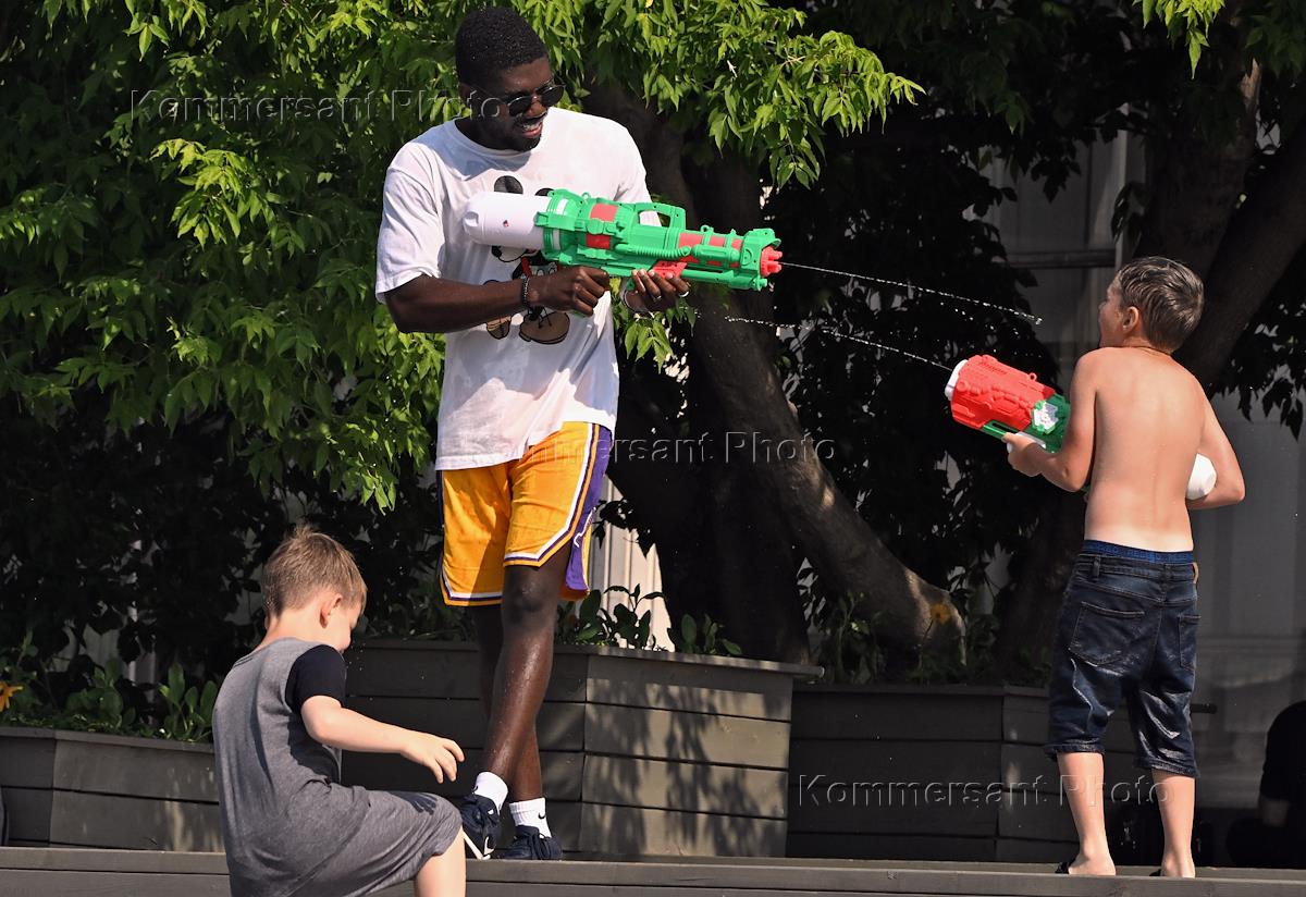Жанровая фотография. Жара в Москве. Темнокожий мужчина играет в водный пистолет с детьми в парке "Музеон".