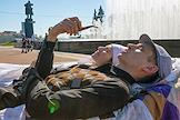 Спектакль-променад "Маршрут Старухи" по мотивам произведений Даниила Хармса. Артистка во время театрального перфоманса на раскладушке на площади Ленина.