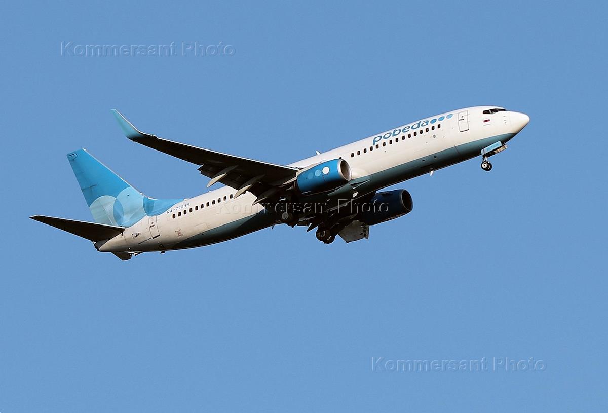 Жанровые фотографии. Самолет авиакомпании "Победа " (Pobeda) во время полета в небе.