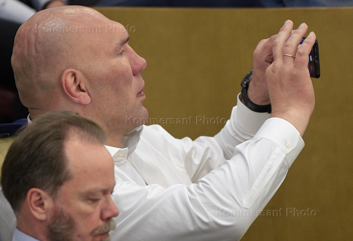 Пленарное заседание Государственной думы (ГД) России. Первый заместитель председателя комитета ГД по культуре Александр Шолохов (слева) и первый заместитель председателя комитета ГД России по туризму и развитию туристической инфраструктуры Николай Валуев (справа) во время заседания.