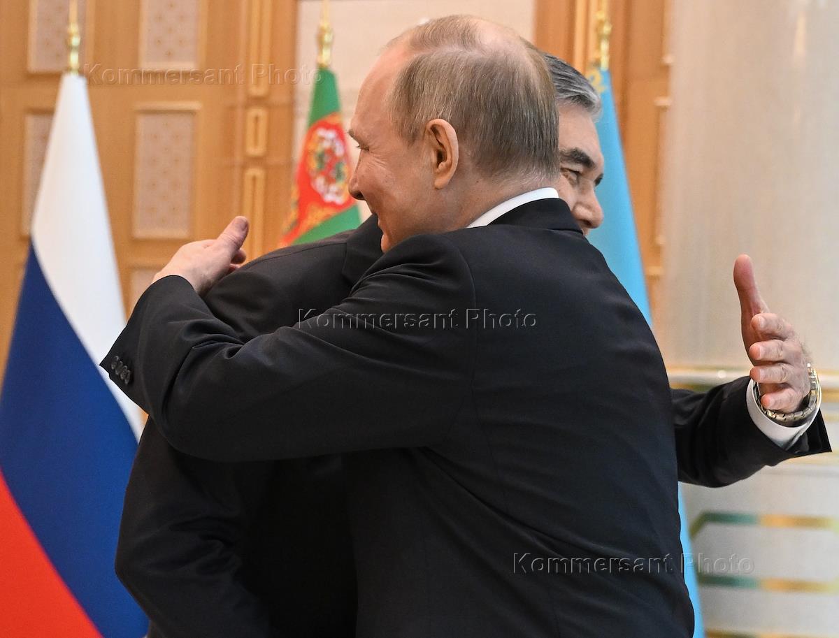Рабочая поездка президента России Владимира Путина в Ашхабад. Президент России Владимир Путин (справа) и председатель Верхней палаты Парламента Туркменистана Гурбангулы Бердымухамедов (в центре) во время встречи в рамках Шестого Каспийского саммита в здании Аппарата председателя Верхней палаты Парламента Туркменистана.