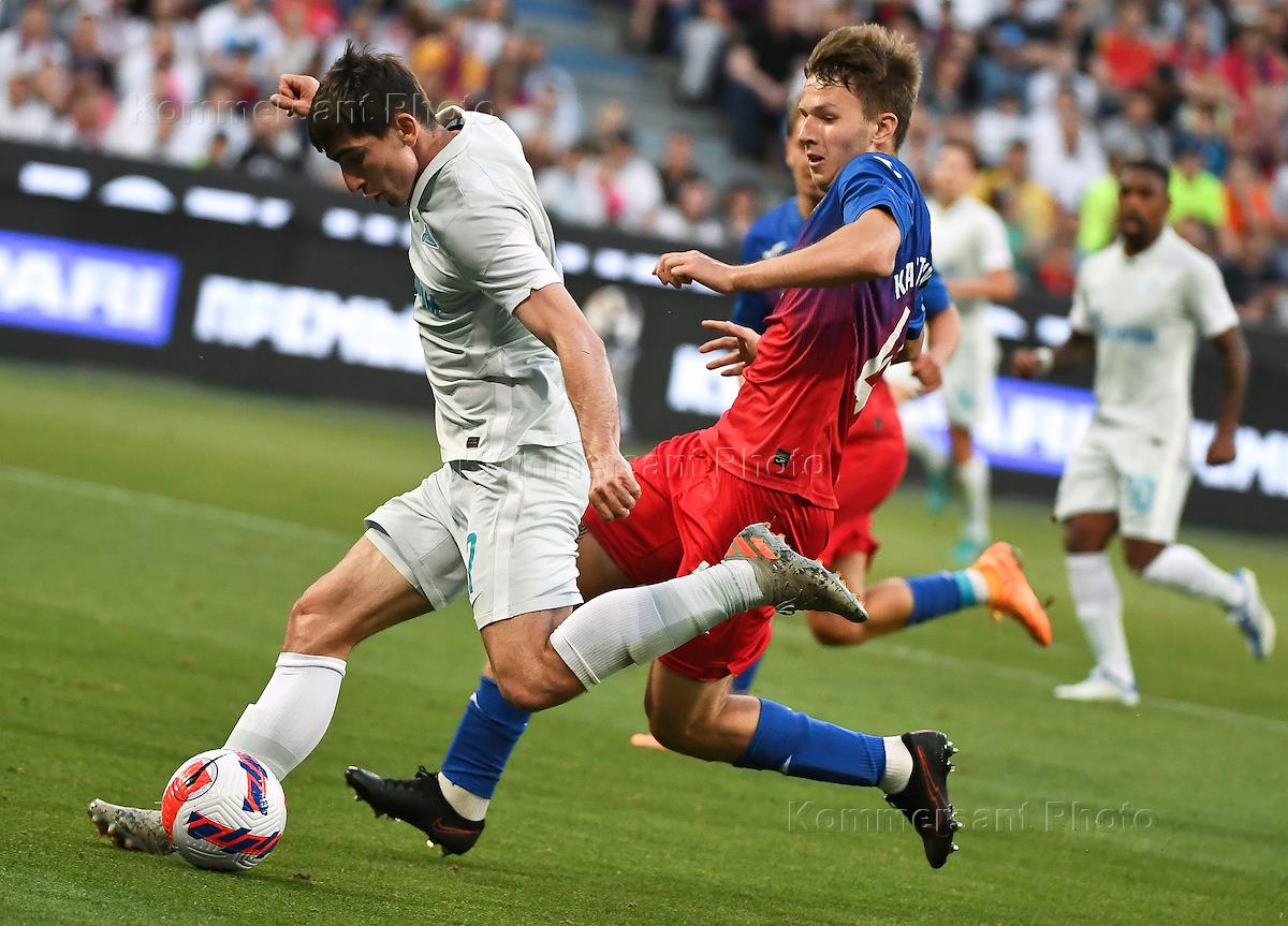 Кубок Pari Премьер по футболу. Матч между командами ЦСКА (Москва) -"Зенит" (Санкт-Петербург) на стадионе "ВЭБ Арена". Игрок команды "Зенит" Кирилл Кравцов (справа) во время матча.