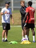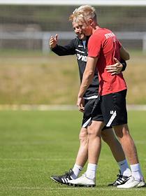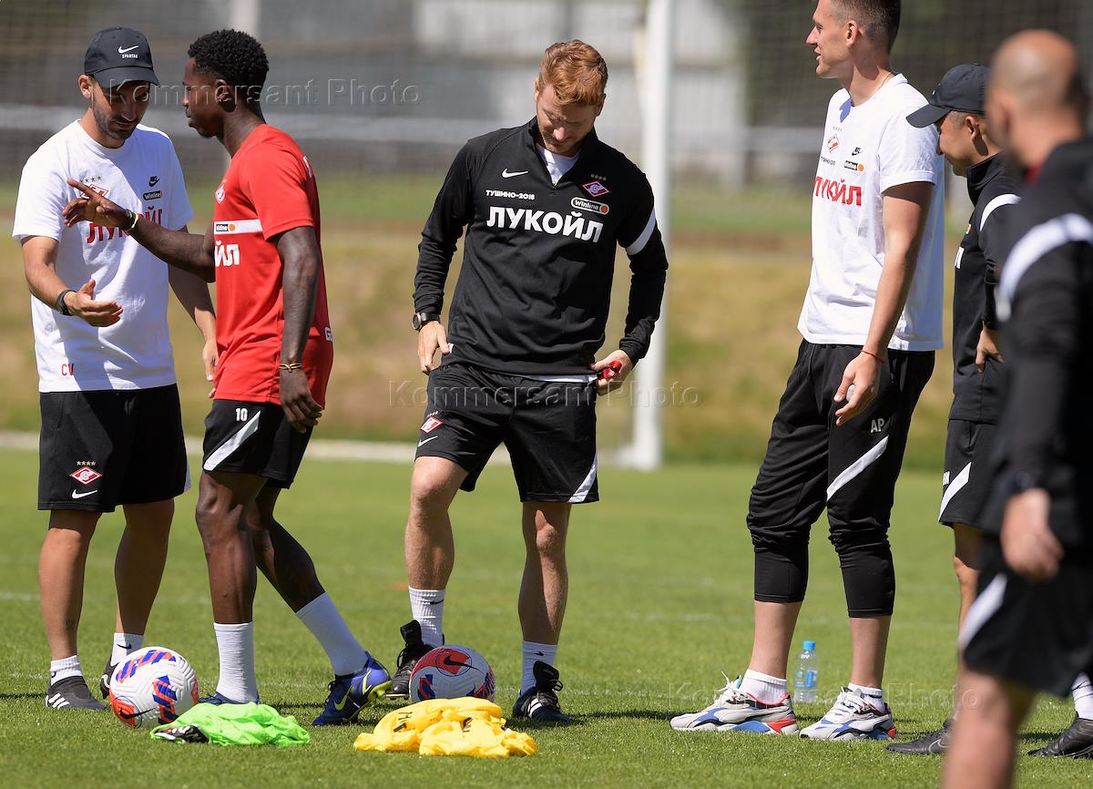 Открытая тренировка футбольной команды "Спартак" на подмосковной учебно-спортивной базе в Тарасовке. Главный тренер команды "Спартак" Гильермо Абаскаль (в центре) и игрок команды "Спартак" Квинси Промес (справа) во время тренировки.
