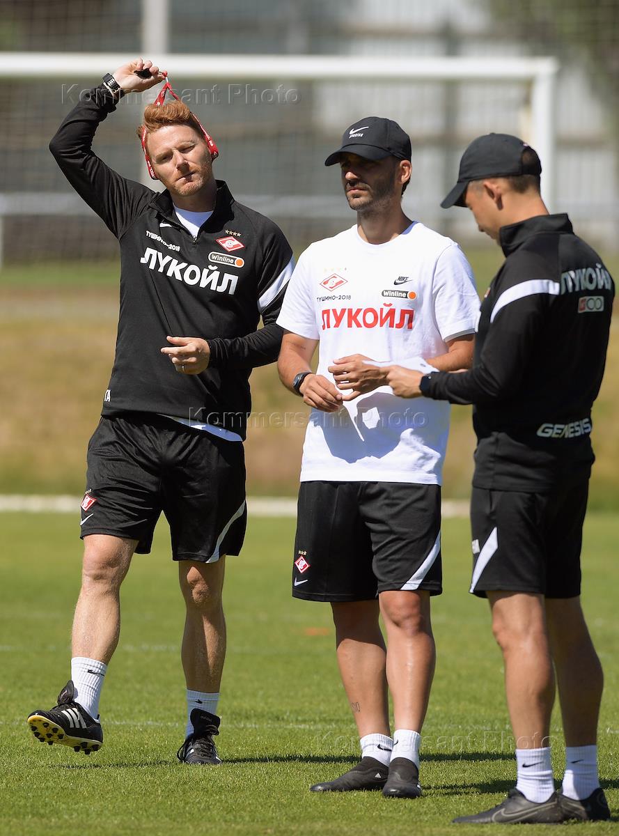 Открытая тренировка футбольной команды "Спартак" на подмосковной учебно-спортивной базе в Тарасовке. Главный тренер команды "Спартак" Гильермо Абаскаль (в центре) и игрок команды "Спартак" Квинси Промес (справа) во время тренировки.