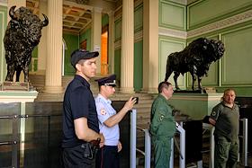 Ситуация в связи с недопуском на внеочередную Городскую конференцию Петербургского отделения Всероссийского общества охраны памятников истории и культуры (ВООПИиК) некоторых избранных делегатов районных конференций и журналистов. Недопущенные делегаты собрались в сквере рядом со зданием ВООПИиК (Литейный, 39) и подписали заявление для СМИ, в котором сообщили, что конференцию считают нелегитимной, а для восстановления законности намерены подавать в суд. Сотрудники охранного предприятия в холле здания ВООПИиК.