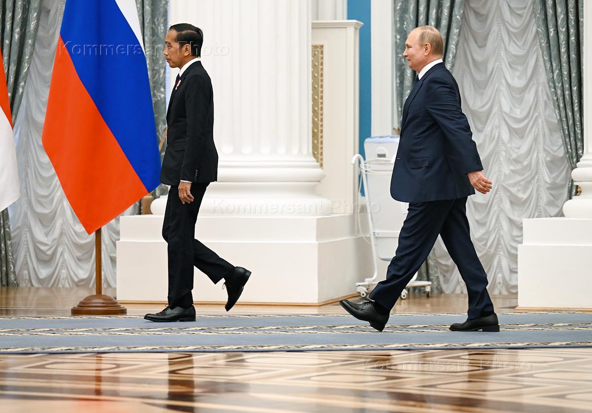 Президент России Владимир Путин (слева) и президент Индонезии Джоко Видодо (справа) во время пресс-конференции по итогам встречи в Кремле.