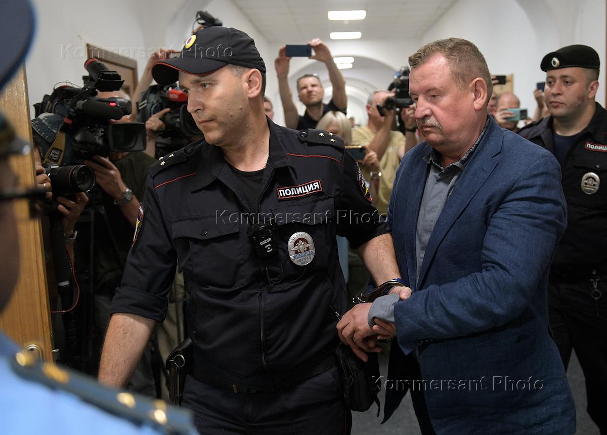 Бывший глава ГУ МВД по Санкт-Петербургу и Ленобласти, генерал-лейтенант Сергей Умнов (справа), обвиняемый в злоупотреблении должностным положением, перед началом заседания Басманного районного суда.