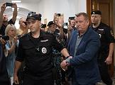 Бывший замначальника ГУ МВД по Петербургу и области Иван Абакумов (слева), обвиняемый в злоупотреблении должностным положением, после заседания Басманного районного суда.