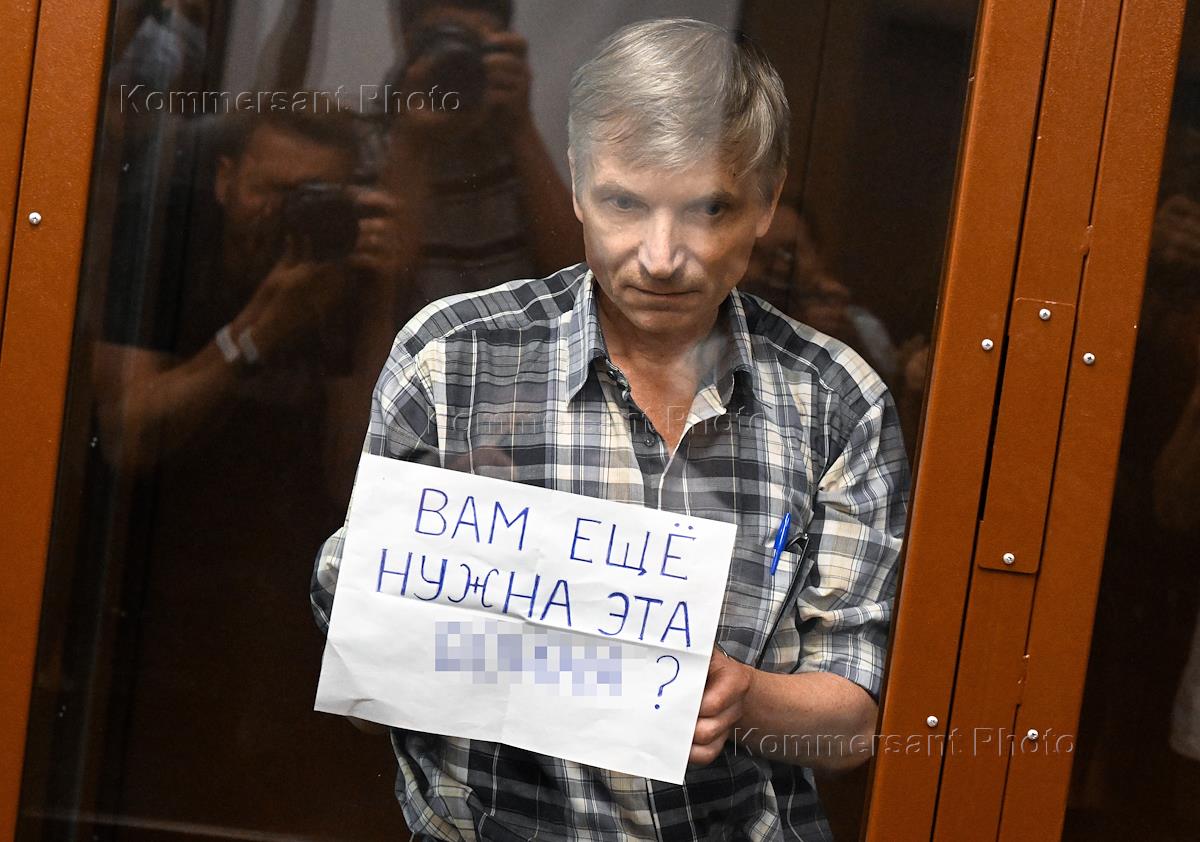 Муниципальный депутат Красносельского округа Алексей Горинов, обвиняемый в дискредитации российской армии и распространении ложных сведений о ней, во время оглашения приговора в Мещанском районном суде.
