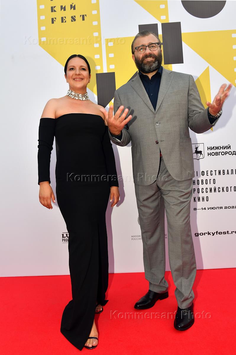 VI фестиваль нового российского кино "Горький fest". Церемония открытия в Академическом театре драмы имени Максима Горького. Генеральный продюсер фестиваля "Горький fest" Оксана Михеева (слева) и президент кинофестиваля "Горький fest", актер Михаил Пореченков (справа) во время церемонии.