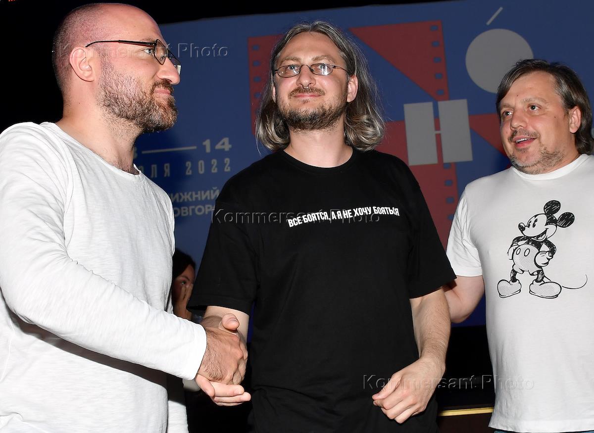 VI фестиваль нового российского кино "Горький fest". Церемония открытия в Академическом театре драмы имени Максима Горького. Режиссер Александр Хант (в центре) перед началом церемонии.