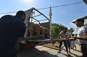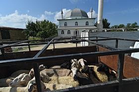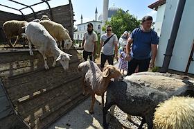 Мусульманский праздник жертвоприношения Курбан-Байрам. Жанровая фотография. Жертвенные бараны перед обрядом жертвоприношения.