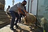 Мусульманский праздник жертвоприношения Курбан-Байрам. Жанровая фотография. Жертвенный баран перед обрядом жертвоприношения.