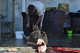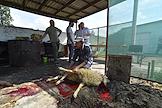 Мусульманский праздник жертвоприношения Курбан-Байрам. Жанровая фотография. Разделка туши жертвенного барана во время обряда жертвоприношения.