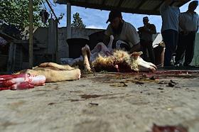 Мусульманский праздник жертвоприношения Курбан-Байрам. Жанровая фотография. Туши жертвенных баранов во время обряда жертвоприношения.