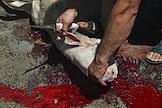 Мусульманский праздник жертвоприношения Курбан-Байрам. Жанровая фотография. Туша жертвенного барана во время обряда жертвоприношения.