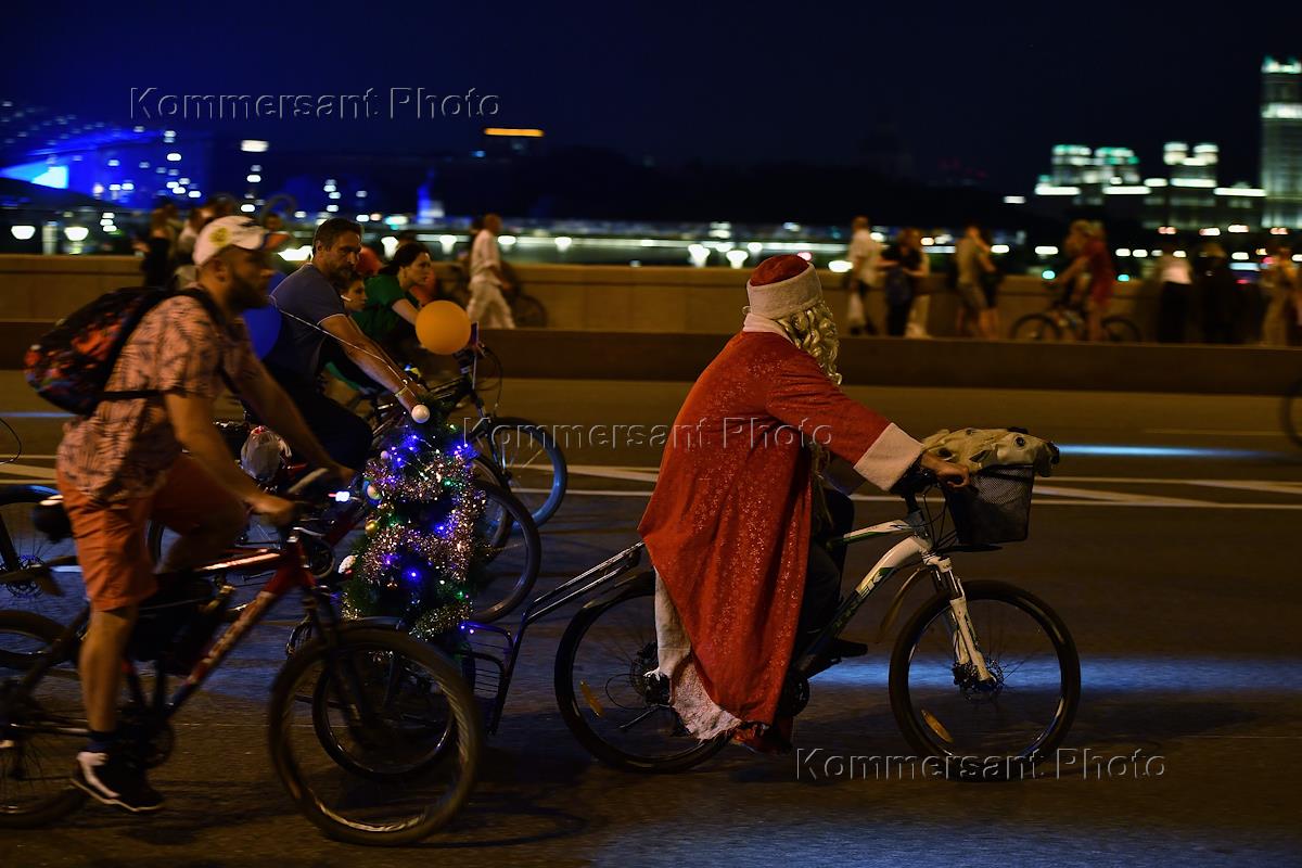 Ночной московский велофестиваль. Жанровая фотография. Участники во время велосипедной прогулки по центру Москвы. Кремлевская набережная.