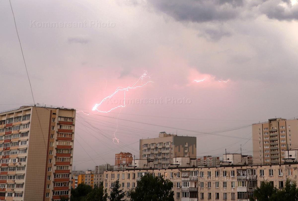 Виды Москвы во время грозы. Жанровая фотография. Молния над жилыми домами.