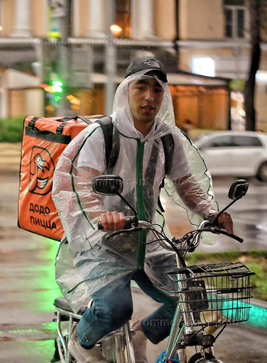 Виды Москвы во время грозы. Жанровая фотография. Молодой человек бежит под дождем.