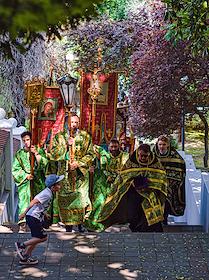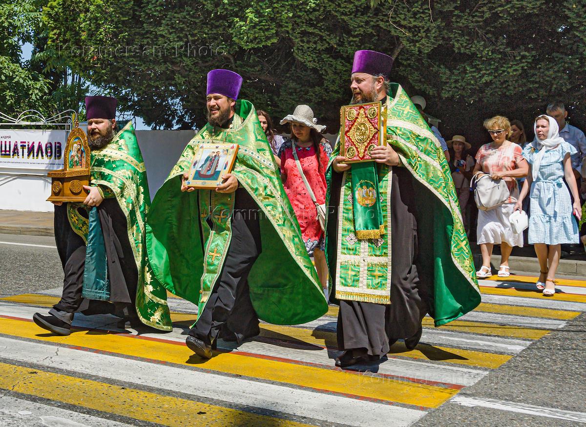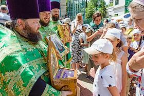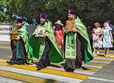 Празднование Дня семьи, любви и верности. Жанровая фотография. Священнослужители и верующие во время Крестного хода от собора Архангела Михаила к памятнику святым благоверным князьям Петру и Февронии на площади имени Николая Островского.