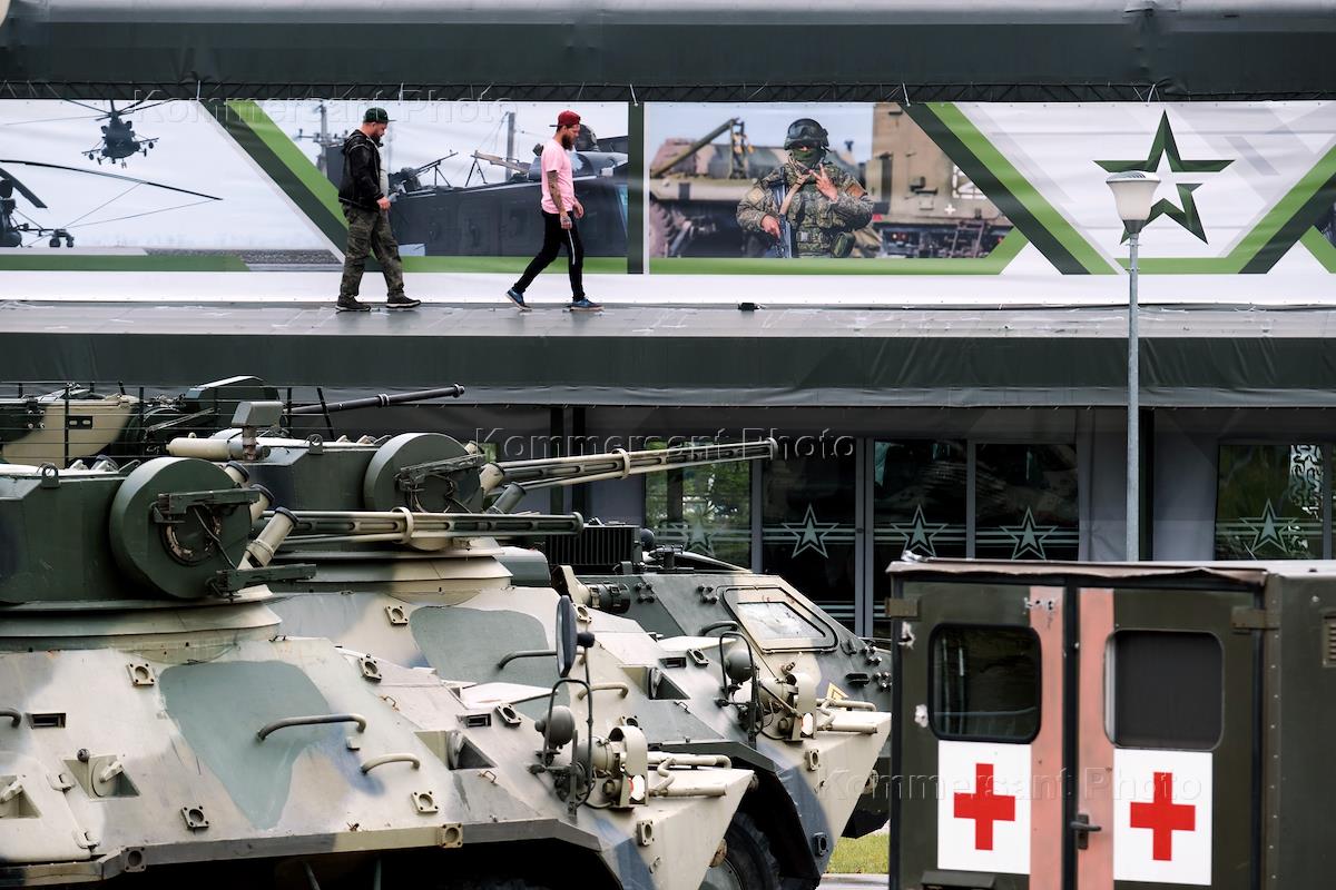 Военно-патриотический парк культуры и отдыха Вооруженных Сил (ВС) России "Патриот". Жанровая фотография. Посетители на территории открытой экспозиции бронетанковой техники.