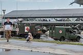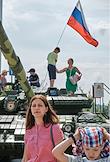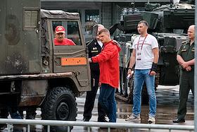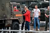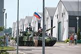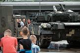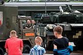 Военно-патриотический парк культуры и отдыха Вооруженных Сил (ВС) России "Патриот". Жанровая фотография. Посетители на территории открытой экспозиции бронетанковой техники.