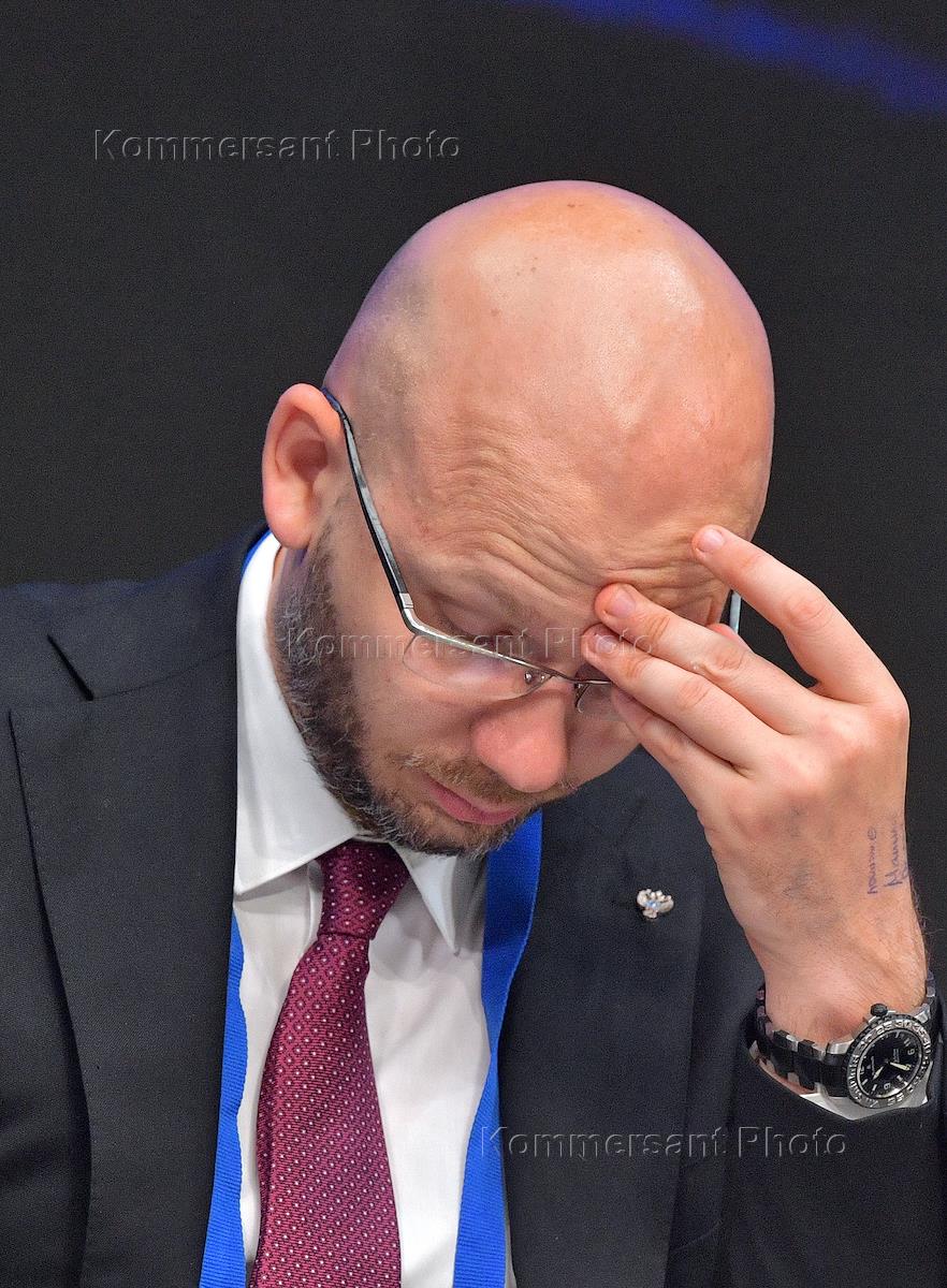 Саммит деловых кругов "Сильная Россия 2022" в Цифровом Деловом Пространстве. Первый заместитель председателя комитета Государственной думы России по экономической политике, федеральный координатор проекта "Локомотивы роста" Денис Кравченко во время саммита.