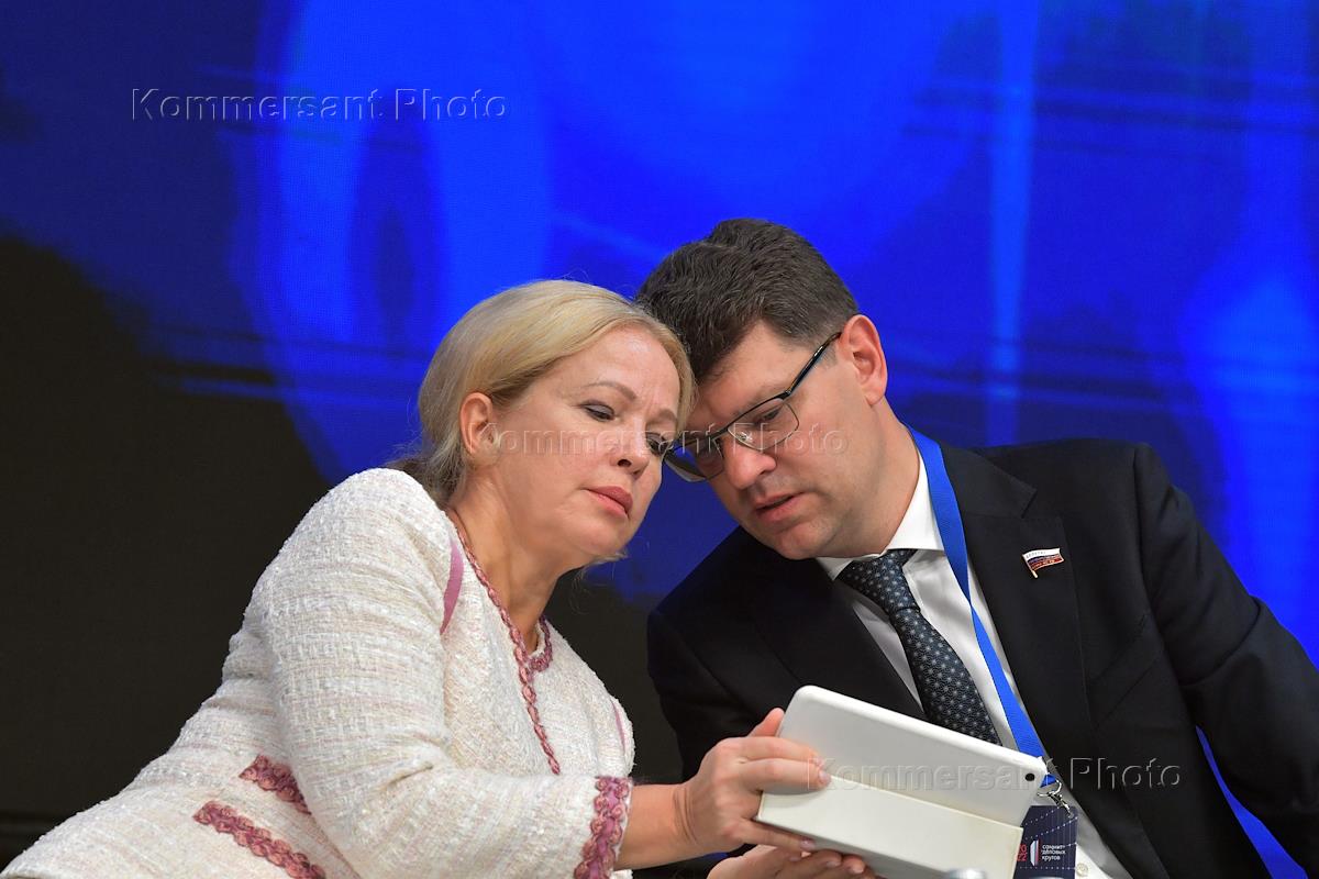 Саммит деловых кругов "Сильная Россия 2022" в Цифровом Деловом Пространстве. Главный управляющий партнер ВЭБ.РФ по городскому развитию Ирина Макиева (слева) и первый заместитель председателя комитета Государственной думы России по экономической политике, федеральный координатор проекта "Локомотивы роста" Денис Кравченко (справа) во время саммита.