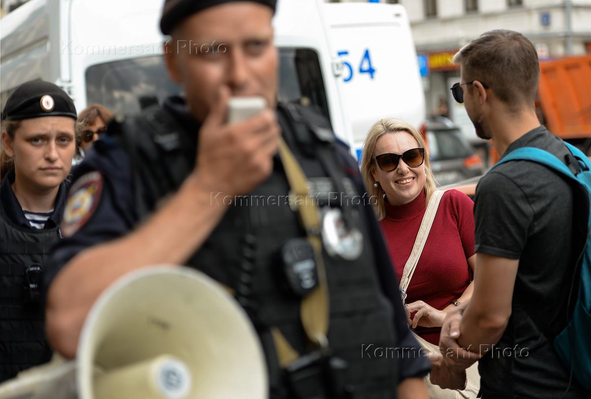 Ситуация у здания Басманного районного суда, где пройдет избрание меры пресечения муниципальному депутату по Красносельскому району Москвы Илье Яшину, задержанному по статье о распространении дезинформации о Вооруженных сил России. Муниципальный депутат района Зюзино Константин Янкаускас (в центре) и адвокат Мария Эйсмонт (слева) у здания суда.