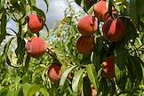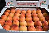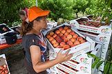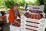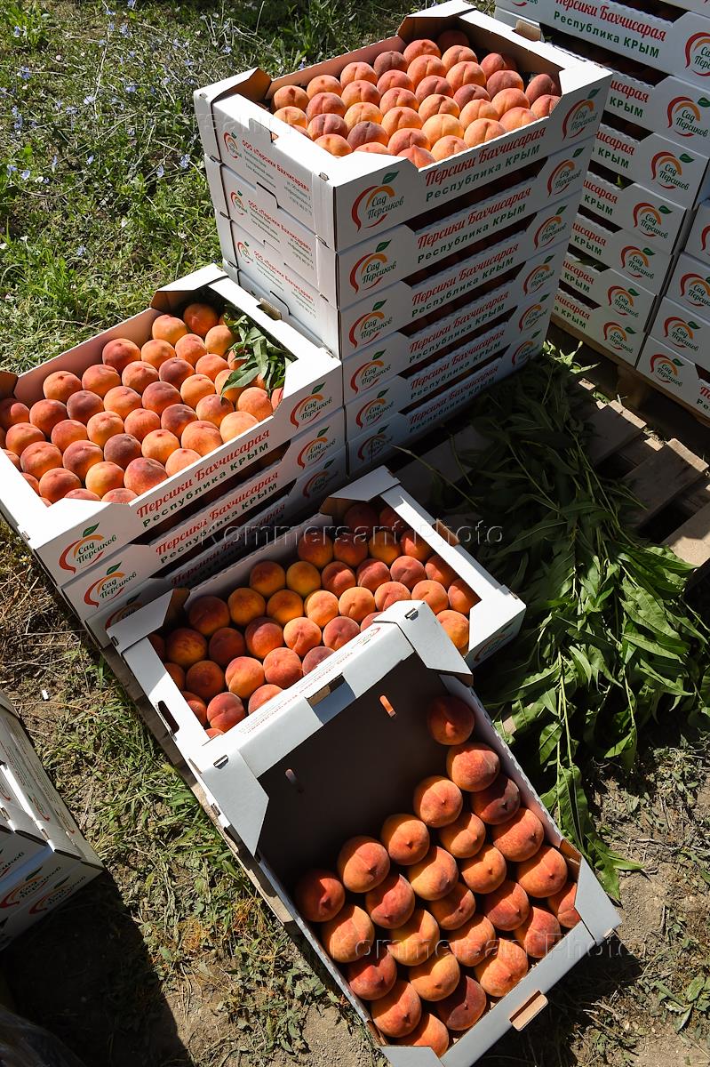 Жанровая фотография. Сбор урожая персиков. Персики, упакованные в картонную тару.