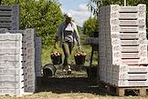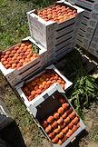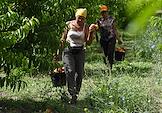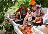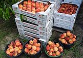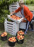Жанровая фотография. Сбор урожая персиков. Персики в пластмассовых ведрах и упакованные в картонную тару.